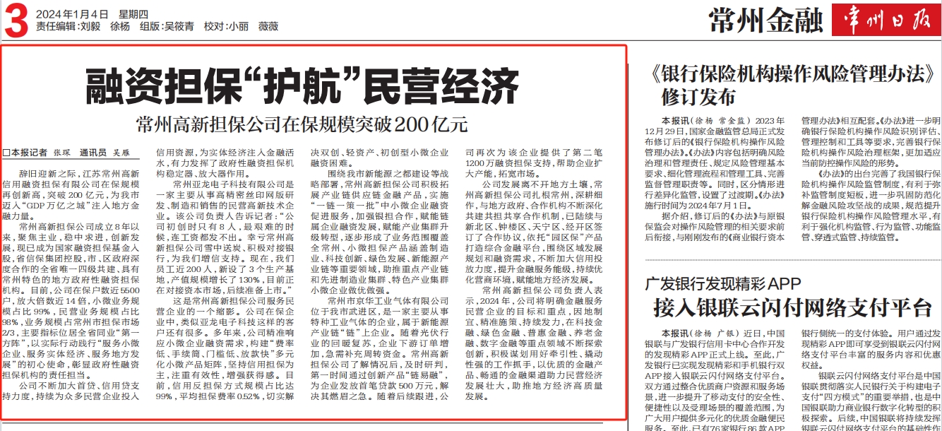 辭舊迎新之際,江蘇常州高新信用融資擔(dān)保有限公司在保規(guī)模再創(chuàng)新高,突破200億元,為我市創(chuàng)建“GDP萬(wàn)億之城”注入地方金融力量。